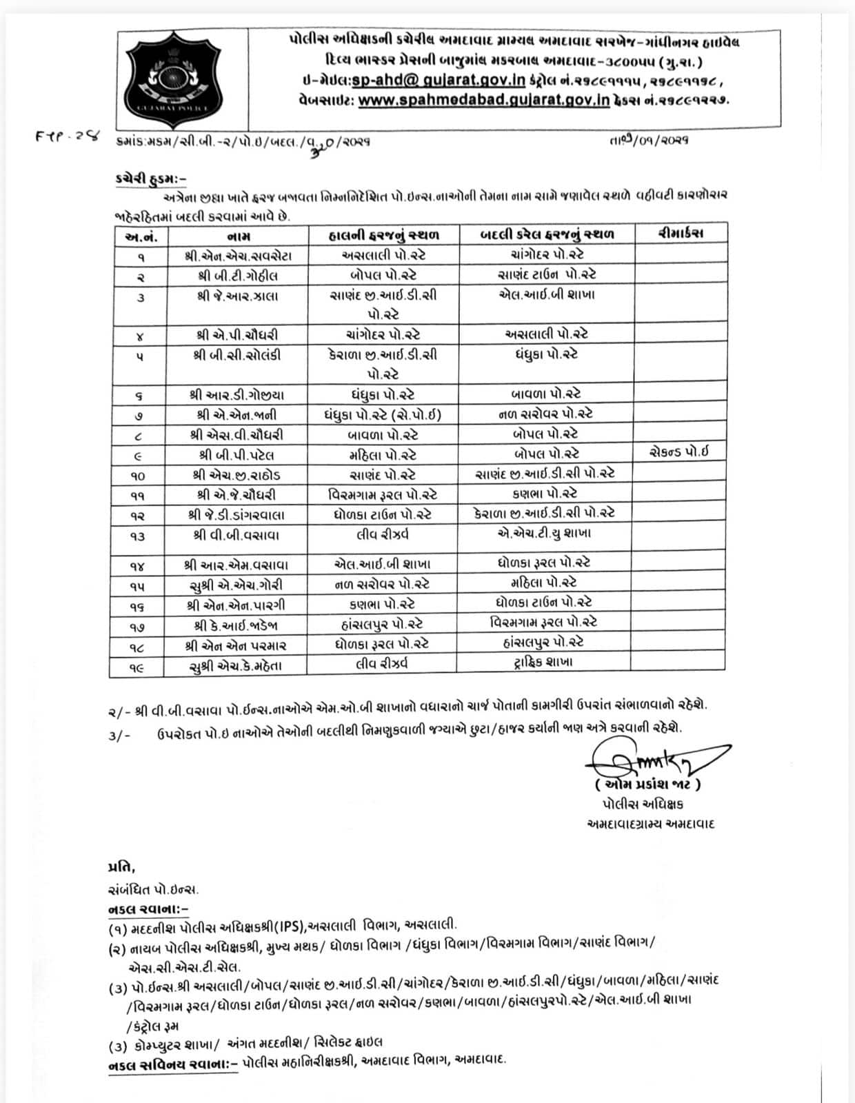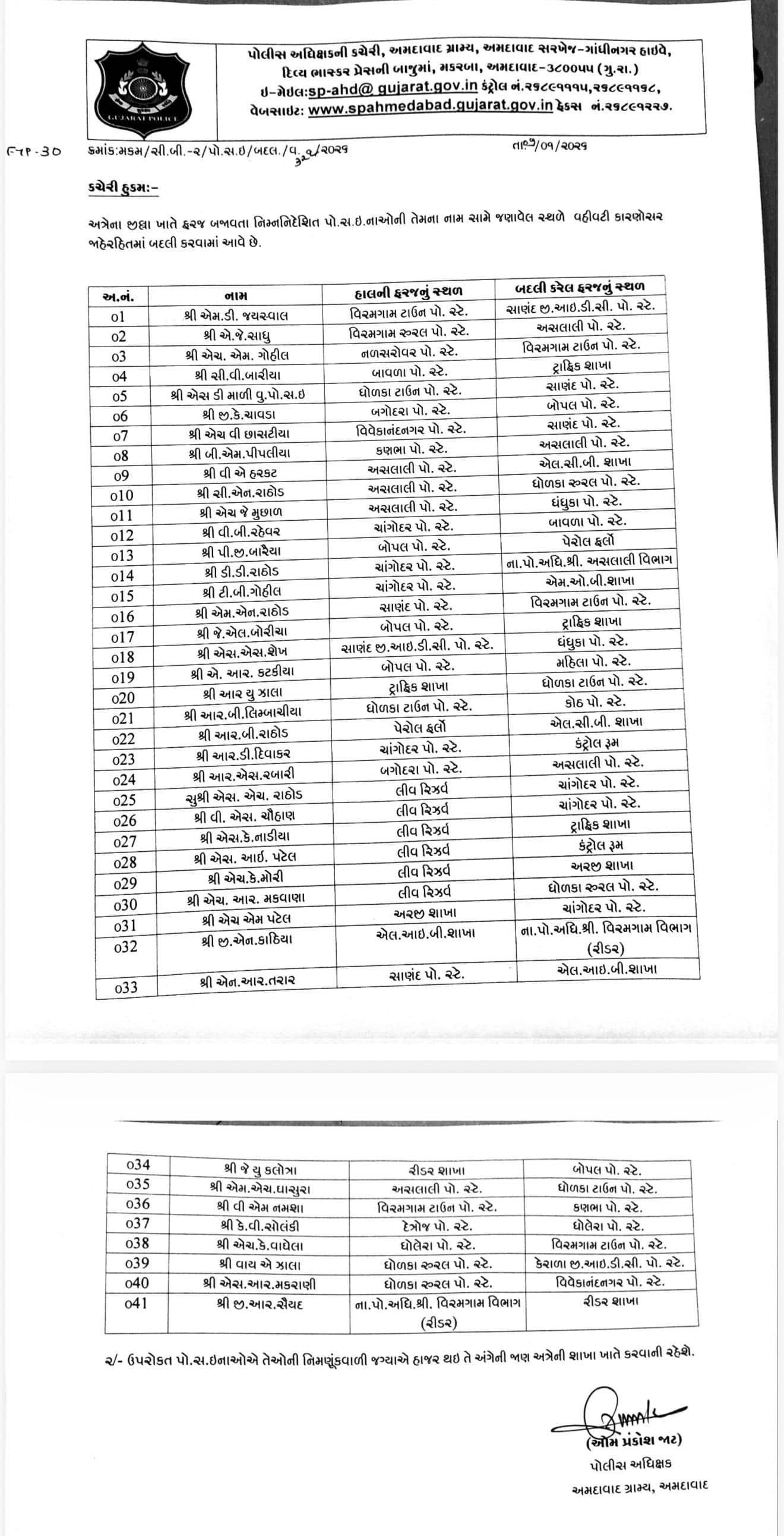 • 19 PI (Police Inspectors) and 41 PSI (Police Sub Inspectors) have been made mass internal transfers in Ahmedabad Rural Police.