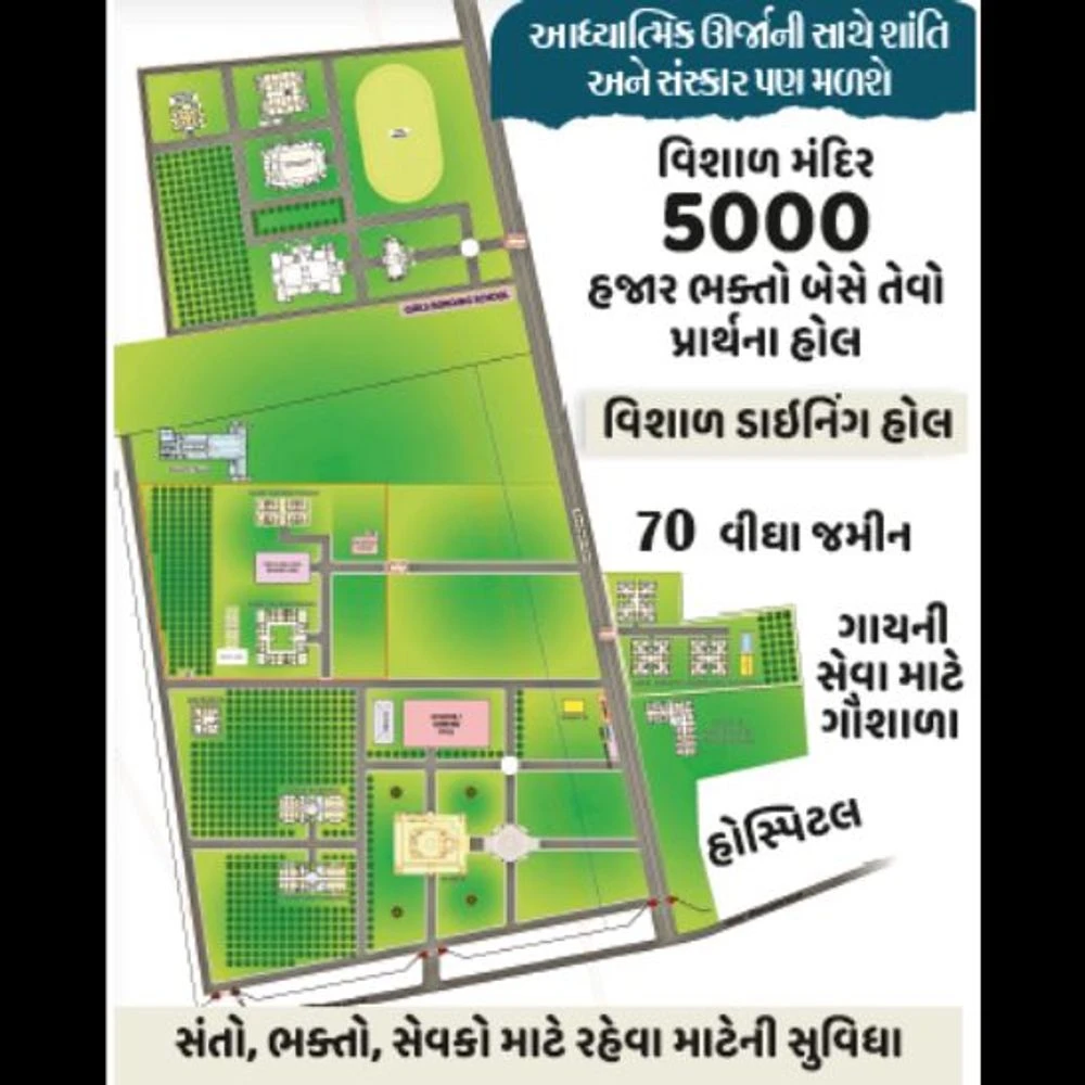 After four years of exile by saints and followers, including Hariprabodham Swami, who had to be separated from the Haridham Sokhada of the Swaminarayan sect, a huge Hariprabodham Dham is going to be built with various facilities in 70 bighas of land at Ganeshpura village in Vadodara district. From today, on October 6, the formal foundation stone laying ceremony will be held at this place. At that time, Divya Bhaskar had obtained details for the devotees with the plan of the temple with what facilities would be built on this new Hariprabodham Dham. Talking to Guruprasad Swami of Hariprabodham Group, he said that a grand construction of Hariprabodham Dham will be done on 70 bighas of land at Ganeshpura village in Vadodara district and Waghodia taluka. A new temple of faith is going to be built on this holy land of culture and spirituality. This holy Dham will not only be a religious centre but will also be a reflection of our spiritual, educational and cultural heritage. Hari Prabodham Dham will have a temple for Bhagwan Shri Hari and other saints along with a spiritual center equipped with modern amenities. Separate accommodation for saints and devotees and facilities for various services will also be provided. With the construction of this Hariprabodham Dham, the entire community will get spiritual energy, peace and sanskar. In future, this Dham will attract lakhs of devotees from Gujarat and all over India and will create a unique identity across the world. This Dham will be a reflection of its educational and cultural heritage. The Dham is going to be constructed.